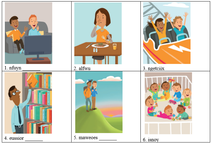 (Nhìn vào các bức tranh. Sắp xếp các chữ cái và viết các tính từ thể hiện quan điểm.)
