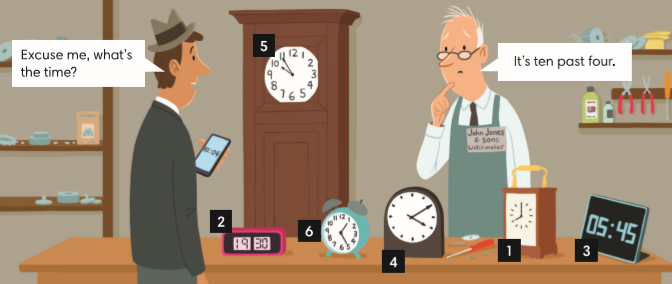 1. In pairs, complete the times for the clocks in the picture. Listen and check.