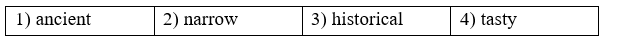 Đường Lâm Village is a(n) 1) _____ village in Hà Nội, Việt Nam. It has a history of 1,200 years. Tourists like walking along its 2) _____ streets and seeing its 3) _____ buildings. There are also markets for you to buy 4) _____ local foods. It's a very interesting place to visit!