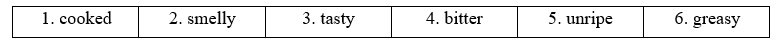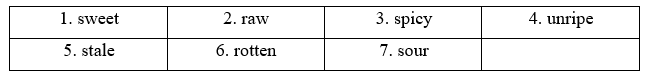 (Hoàn thành hệ thống từ với các ví dụ về thực phẩm cho mỗi tính từ.)