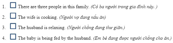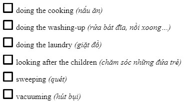 (Đánh dấu vào những công việc gia đình mà bạn nghe thấy trong cuộc trò chuyện.)