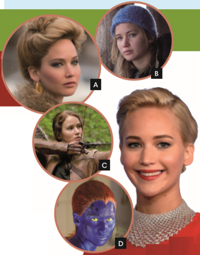 Jennifer Lawrence hai mươi bảy tuổi. Cô đến từ Kentucky, Hoa Kỳ. Cô ấy thân thiện và vui tính. Cô ấy mảnh khảnh, cao (1,75 m) và xinh xắn. Đôi mắt của cô ấy màu xanh và mái tóc của cô ấy màu vàng. Nhưng Jennifer là một nữ diễn viên và các nữ diễn viên có thể thay đổi ngoại hình của họ.