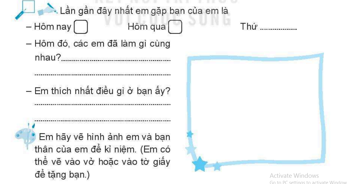 Nhớ lại lần gặp mặt gần nhất giữa em và bạn thân là hôm nào và viết ra những hoạt động hôm đó các em là cùng nhau ( xem phim, đi ăn, đi khu vui chơi…), điều gì ở bạn ấy làm em ấn tượng và thích nhất ( vui tính, chăm chỉ, ngoan ngoãn…)