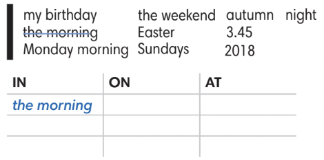 2. We usually take our dog for a walk three times every day – in / at the morning, in / at the evening and in / at night.