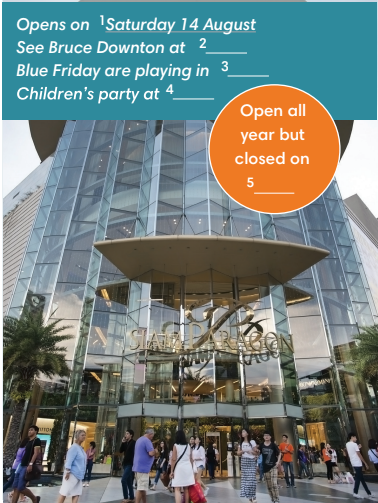 (Nghe thông báo và hoàn thành thông tin về Trung tâm mua sắm TwoTrees.)