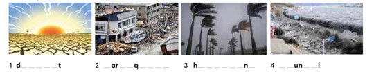 (Hoàn thành tên của các thảm họa trong hình và gạch bỏ một tùy chọn không mô tả mỗi hình.)