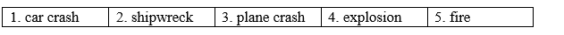Last night, my brother and I were sleeping when we heard a loud noise on the street outside. It sounded like a 1) explosion. We knew that something was wrong. We looked out of the window and saw that there was a 2) fire in the house opposite. The firefighters arrived very quickly and put it out. Later, Dad told us that the accident didn't kill or 3) injure anyone. I was very 4) relieved because everyone was safe.