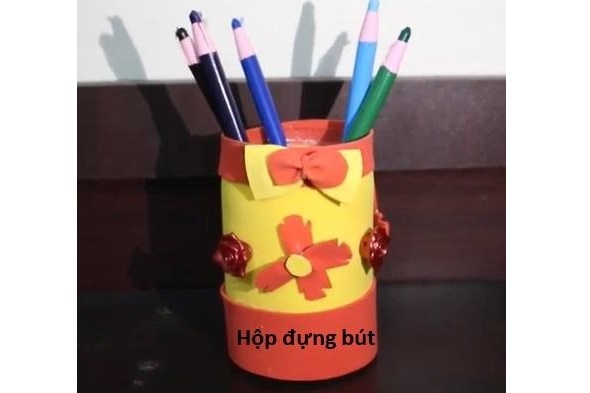 Chú ý: Nếu em không thích màu ban đầu của hộp, có thể dùng giấy màu thay đổi màu hộp trước, sau đó thực hiện các bước trang trí, sáng tạo.