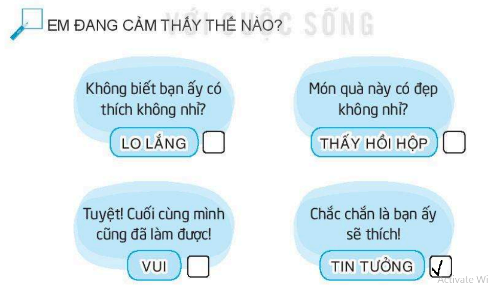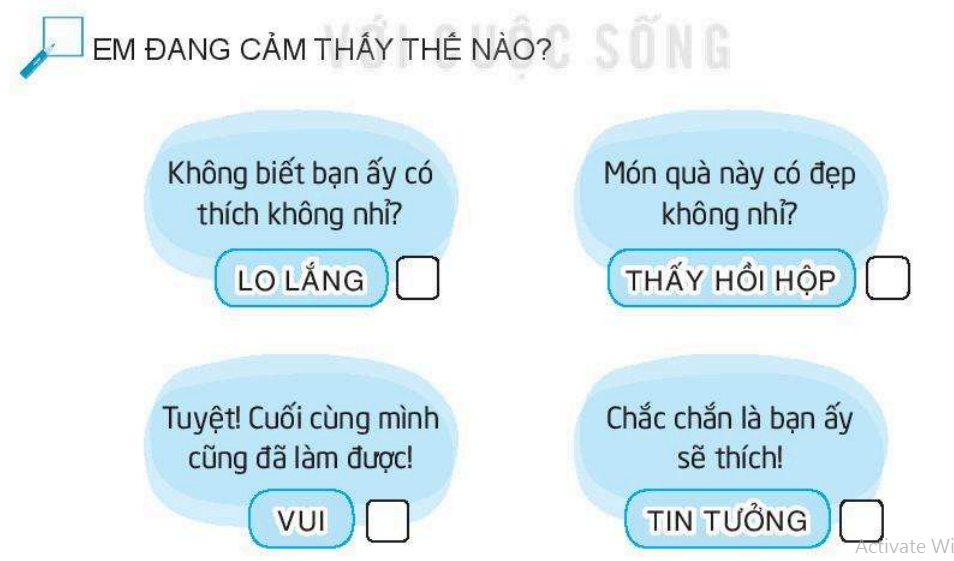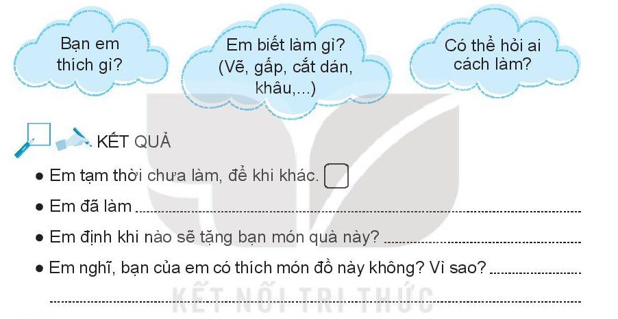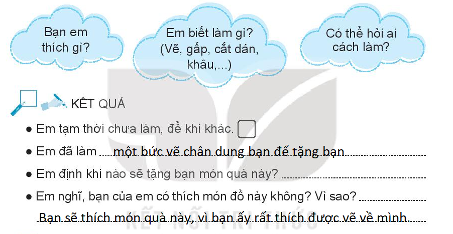 Em hãy trả lời các câu hỏi: Bạn em thích gì? ( búp bê, hoa…), Em biết làm gì? ( vẽ, xé dán… ), em có thể hỏi ai cách làm ?(bố, mẹ, anh chị…)