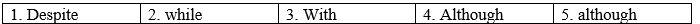 Back in the 1990s, a popular way of learning in Vietnamese schools was rote learning. (1) _______ innovative methods employed by some of my teachers, there was not so much difference in the way knowledge was transferred to us. We were not encouraged to take an active part in the lessons because teachers talked nearly all the time. As far as I can remember, the curriculum primarily focused on academic subjects like mathematics and literature, (2) _______ soft skills and some subjects like PE or music received very limited attention. (3) _______ the teacher-centered instruction, lack of student engagement, and unequal attention to non-academic subjects, students worked very hard and still achieved great success. (4) _______ some students still do not engage in today's classrooms, I personally believe that Vietnamese education is changing. I have seen many teachers using interactive learning methods and what I'm impressed the most is that teachers pay more attention to developing the 21st century skills, (5) _______ classrooms are still large in size and resources are somehow limited.