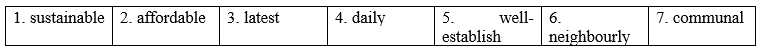 1. able to continue without causing damage to the environment 2. inexpensive 3. most recent 4. happening every day 5. existing for a long time and respected or trusted by people 6. behaving in a friendly way towards the people who live near you 7. shared by a group of people who live together |