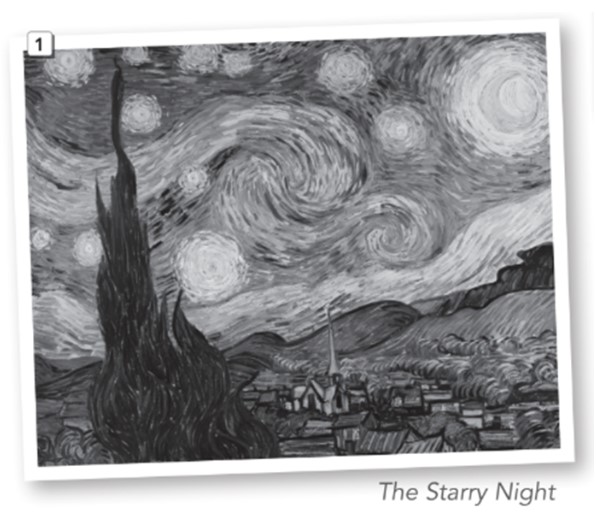 1. Match the paintings with the artists.2. Read the following statements. Write true (T) or false (F). 3. Listen to a radio program and check your answers in Exercise 1.4. Listen again. Choose the correct answer. 5. Which painting in Exercise 3 do you like best and why? Write five sentences about the painting.