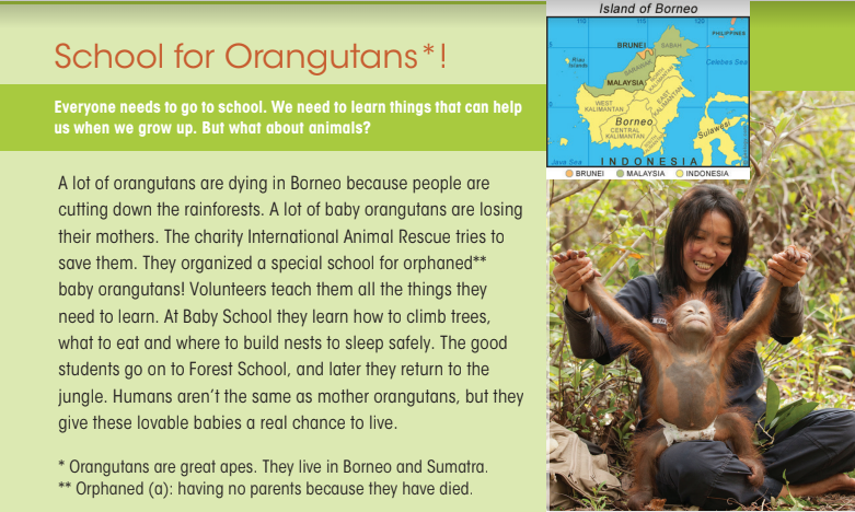 Rất nhiều đười ươi đang chết ở Borneo vì con người đang phá rừng. Có rất nhiều đười ươi con đang mất mẹ của nó. Tổ chức từ thiện cứu hộ động vật quốc tế cố gắng bảo vệ họ. Họ tổ chức trường học đặc biệt cho đười ươi ** con mồ côi! Tình nguyện viên dạy chúng tất cả những gì họ cần học. Ở trường cho trẻ sơ sinh họ dạy cách trèo cây, những gì cần ăn và xây dựng những cái tổ ở đâu để ngủ cho an toàn. Những học sinh tốt đi đến trường học rừng, và sau đó họ quay trở lại rừng. Con người không giống mẹ của đười ươi, nhưng họ cho những đứa trẻ đáng yêu này một cơ hội thật sử để sống.