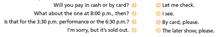 1. Match the exchanges. 2. Choose the correct response. Read the exchanges aloud. 3. Complete the dialogue with the sentence below. Read the dialogue aloud. Mind the sentence stress.