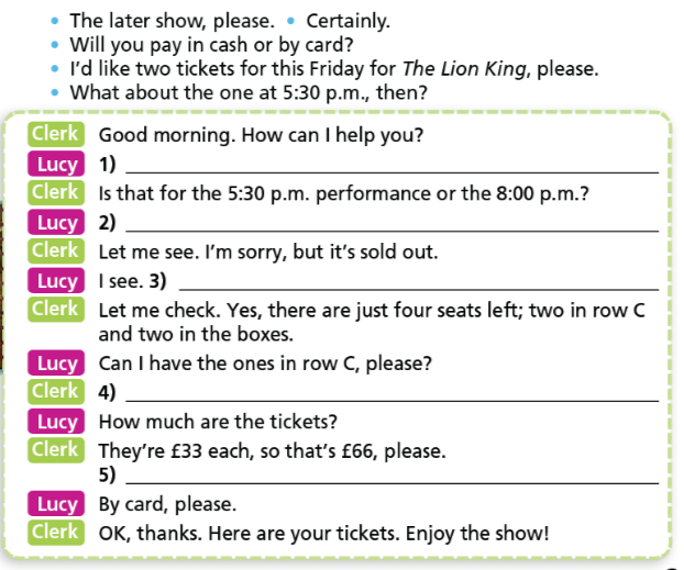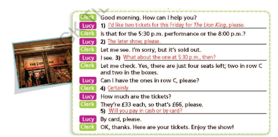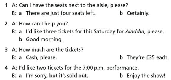 B: Tôi muốn mua 2 vé ngày hôm nay xem vua sưu tử.