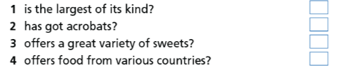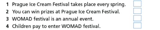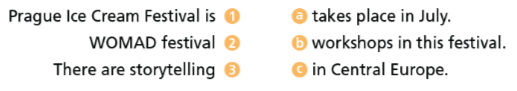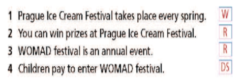 1. Read the texts. Make the phrases (1-3) to the phrases (a-c). 2. Read the text. Decide if the statement are Wrong (W), Right (R) or DS (Doesn’t Say). 3. Read the text. Which fesstivals, A or B, …….