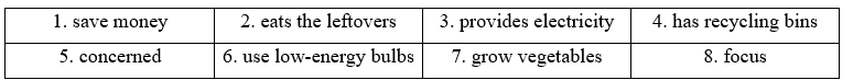A: We'll 6 use / buy / make low-energy light bulbs in all the classrooms. We'll also 7 clean / have / empty recycling bins in every classroom and in the school grounds.