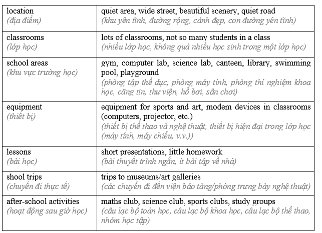 (Ngôi trường lý tưởng của tôi là một ngôi trường lớn với sân chơi lớn và nhiều phòng học tiện nghi.)