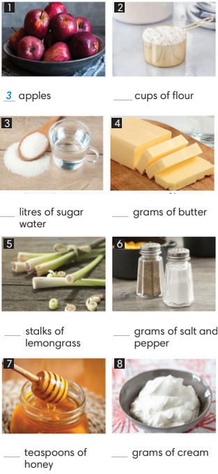 1. Listen and write the amount of each ingredient you hear. 2. Number the steps to make apple crumble in order. 3. Answer the questions.