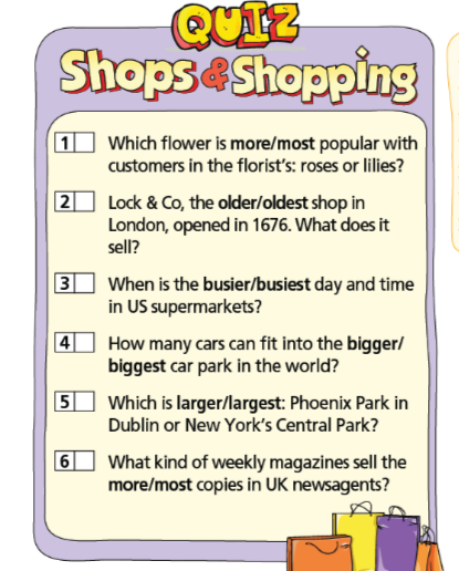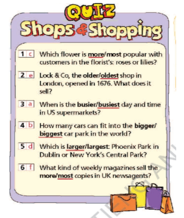 1. a) Choose the correct option. Then try to answer the quiz. b) Now match the questions in Exercise 1a to the answer (a-f). how many did you get right? 2. Fill in the comparative and superative forms. Then use comparative and superative forms from the table to complete the sentences below. 3. Put the adjectives in brackets into the correct comparative or superative form.