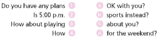 1. Choose the correct responses.2. Match the columns to make complete questions.3. Complete the dialogue with the sentences from Exercises 1 and 2. 4. Listen and underline the stressed words in each sentence. Then practise saying them.