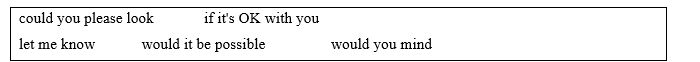 1 Complete the requests with the phrases below. 2 Match 1-5 with a-e to make sentences. 3 Write the phrases below in the correct group. 4 Complete the message with the phrases below.5 Read the message. Write a note to Dave. Follow the instructions below.