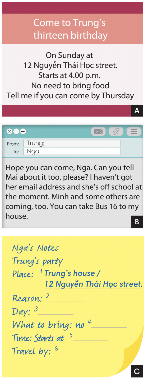 3. Read the information (A) and the email (B). Then complete the information in Nga’s notes (C).
