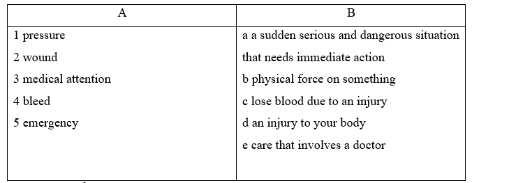 1. Match the word in column A to its definition in column B 2. Match the instructions with the problems. Write broken bone, choking, loss of consciousness, nose bleed, bee sting in the blanks. 3. Read the dialogue. Answer the questions.