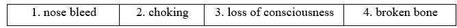 2. Match the instructions with the problems. Write broken bone, choking, loss of consciousness, nose bleed, bee sting in the blanks.