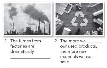 1. Look at the pictures and complete the sentences with the correct form of the words / phrases from the list.2. Choose the correct word to complete the sentences. 3. Use the following words to complete the leaflets: conserve, environment, communities, limit, reuse, save.4. List 5 activities that students should do to protect the environment.
