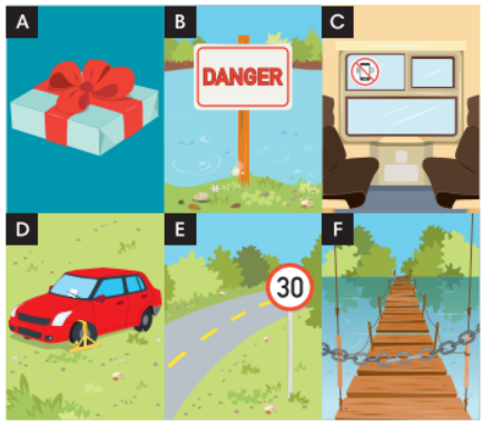 (Ghép hình A-F với các câu 1-6.)