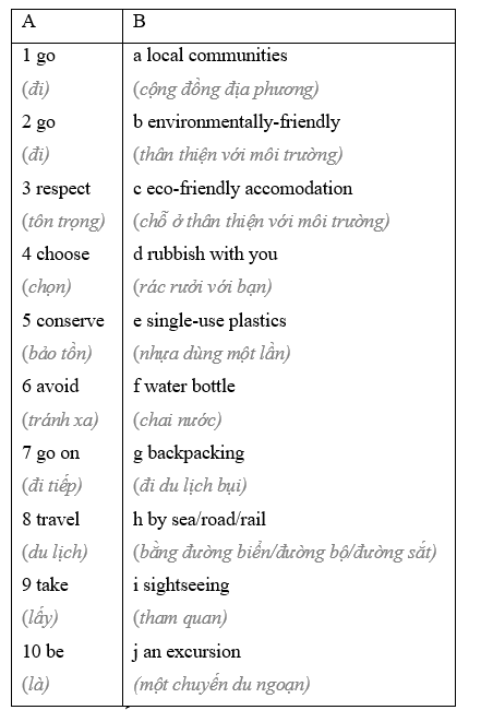(Nối các từ/cụm từ ở cột A với các từ/cụm từ thích hợp ở cột B để tạo thành các cụm từ.)
