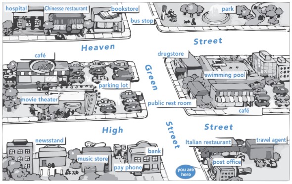 1. Complete the sentences with the words below. 2. Look at the map and write the correct places next to the descriptions. 3. Look at the map and complete the directions with one word in each blank.4. Read the directions and write the correct places. 5. Find and correct the mistake in each sentence.