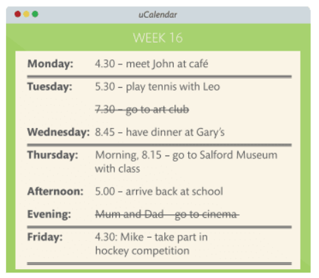 5. She’s going to Salford Museum with her class (at 8.15) on Thursday morning.