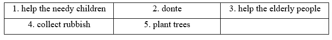 1. Match the pictures with the suitable community activities. 2. Match the words (1-6) to the words (a-e) to form phrases. 3. Listen and complete Yen's note about the time and location of all community activities. Write no more than TWO words in each blank.