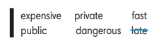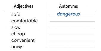 Adjectives Safe Comfortable Slow Cheap Convenient Noisy |