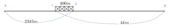 Đoạn đường AB dài \(2345\,m\) và đoạn đường CD dài \(4\,km\). Hai doạn đường này có chung nhau một cây cầu từ C đến B dài \(400\,m\)