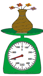 Quan sát kim chỉ trên mặt cân đồng hồ đang ở vị trí số bao nhiêu để đọc được số gam của lọ hoa.