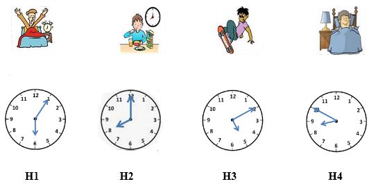 Cho các hoạt động và thời gian tương ứng trong mỗi bức tranh dưới đây, em hãy điền số thích hợp vào chỗ trống.