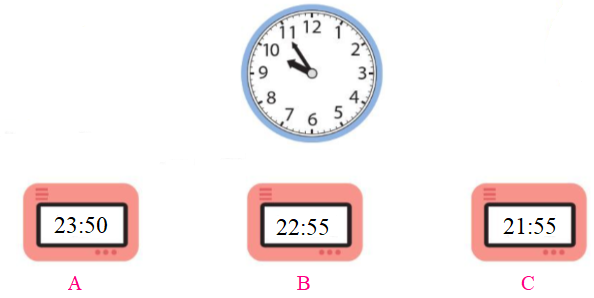 Quan sát thời gian trên đồng hồ rồi chọn đồng hồ điện tử chỉ cùng thời gian vào buổi tối.