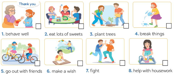 2. Tick (✓) the activities children should do at Tet and cross (x) the one they shouldn't.