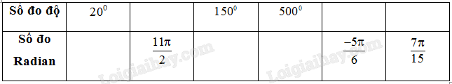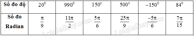 \({20^0} = 20.\frac{\pi }{{180}} = \frac{\pi }{9}\). \({150^0} = 150.\frac{\pi }{{180}} = \frac{{5\pi }}{6}\). \({500^0} = 500.\frac{\pi }{{180}} = \frac{{25\pi }}{9}\)