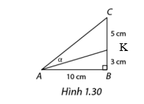 \(\begin{array}{l}\tan \widehat {CAB} = \frac{{BC}}{{AB}} = \frac{{CK + BK}}{{AB}} = \frac{8}{{10}}\\\tan \widehat {KAB} = \frac{{BK}}{{AB}} = \frac{3}{{10}}\\\tan \alpha = \tan \left( {\widehat {CAB} - \widehat {KAB}} \right) = \frac{{\tan \widehat {CAB} - \tan \widehat {KAB}}}{{1 + \tan \widehat {CAB}\tan \widehat {KAB}}} = \frac{{25}}{{62}}\end{array}\)