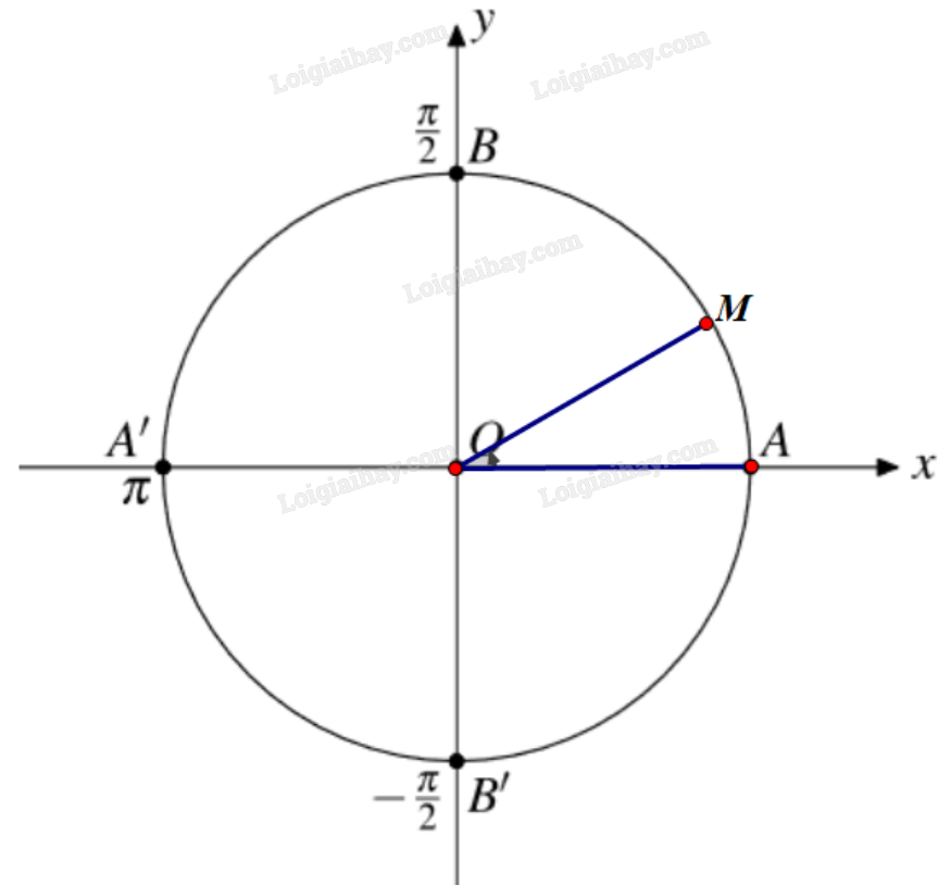 Điểm trên đường tròn lượng giác biểu diễn góc lượng giác có số đo \(\alpha \) là điểm M trên đường tròn lượng giác sao cho sđ(OA, OM) = \(\alpha \).