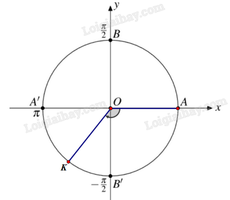 b) Điểm K trên đường tròn lượng giác biểu diễn góc lượng giác có số đo \(\frac{{ - 5\pi }}{7}\) được xác định như trên hình.