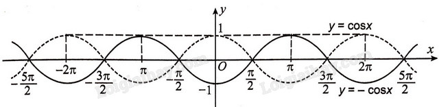 Trong hình trên, đồ thị hàm số \(y = \cos {\rm{ }}x\) là đường nét đứt còn đồ thị hàm số \(y = \, - \cos {\rm{ }}x\) là đường nét liền.