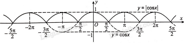 \(y = \,|\cos {\rm{ }}x|\, = \left\{ \begin{array}{l}\cos x\,\,\,\,\,\,{\rm{khi}}\,\,\,\cos x \ge 0\\ - \cos x\,\,{\rm{khi}}\,\,\,\cos x < 0\end{array} \right.\)