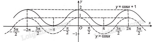 c) Để vẽ hàm số \(y = \cos {\rm{ }}x + 1\) đầu tiên ta vẽ hàm số \(y = \cos {\rm{ }}x\), sau đó dịch chuyển đồ thị này dọc theo trục Oy lên phía trên 1 đơn vị, ta được đồ thị hàm số. Trong hình dưới đây, đồ thị hàm số \(y = \cos {\rm{ }}x + 1\) là đường nét liền.