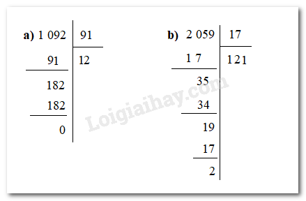 Tìm thương và số dư (nếu có) của các phép chia sau: a) 1 092 : 91 b) 2 059: 17.