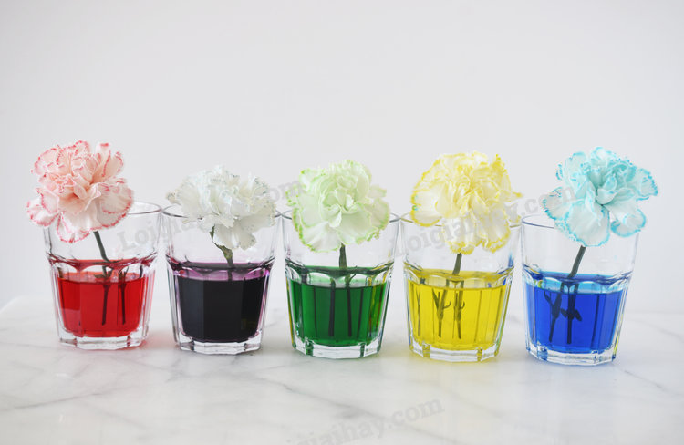 a) Sau khoảng một giờ cánh của bông hoa bắt đầu đổi màu giống với màu của dung dịch nước màu.